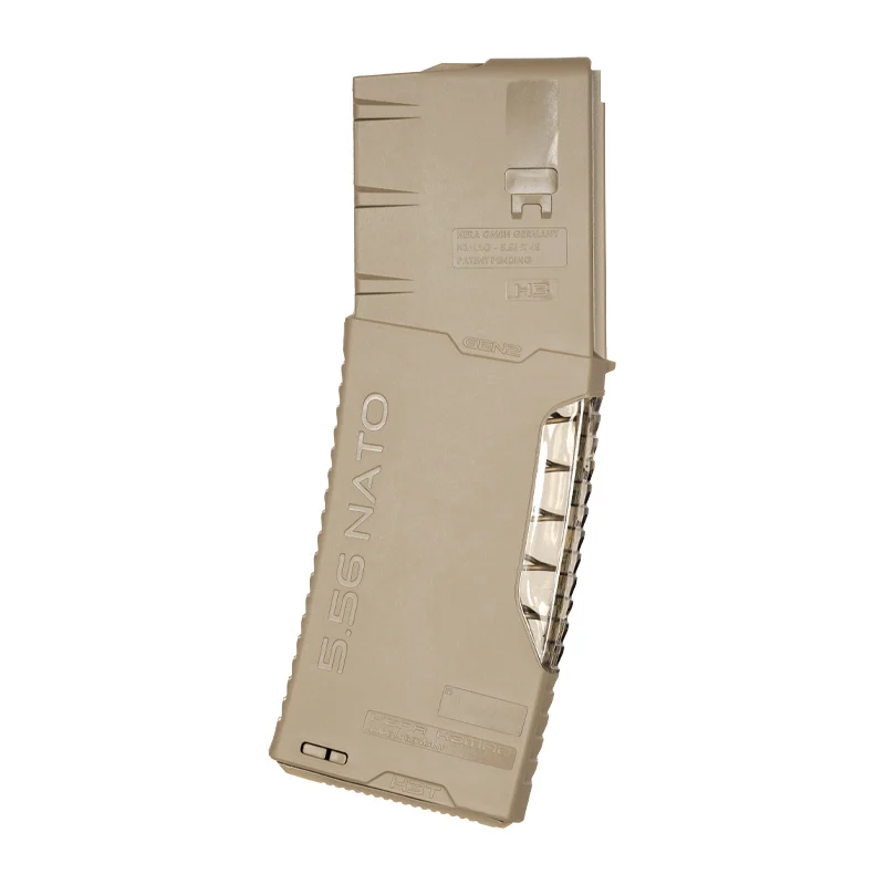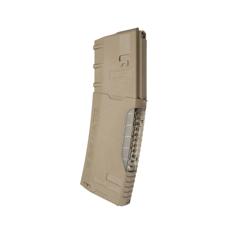 A 30-round magazine designed for AR-15s in FDE tan. Crafted from impact-modified polymer, our magazines boast enhanced features including a stabilized feeder and a built-in mechanical stop to prevent over-insertion when the lock is disengaged. The H3 variant includes a transparent rear spine for convenient round counting and a tactical look. Offered in black, tan, and green. Complete your Hera look and shop our CQR Gen 1 and CQR Gen 2 collections of butt stocks and front grips.