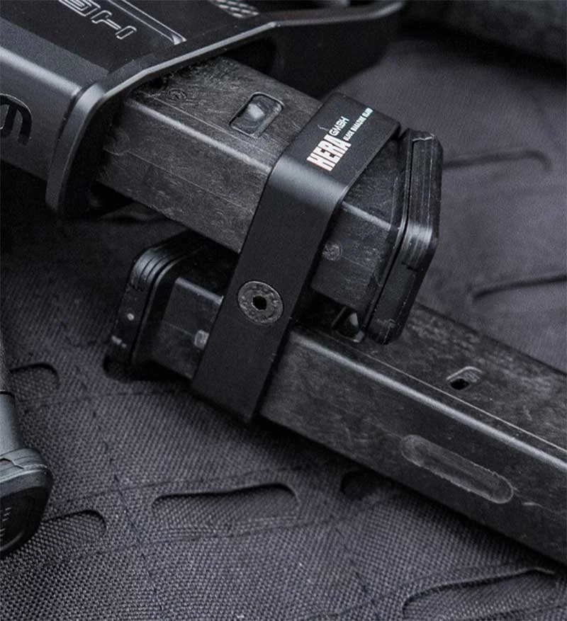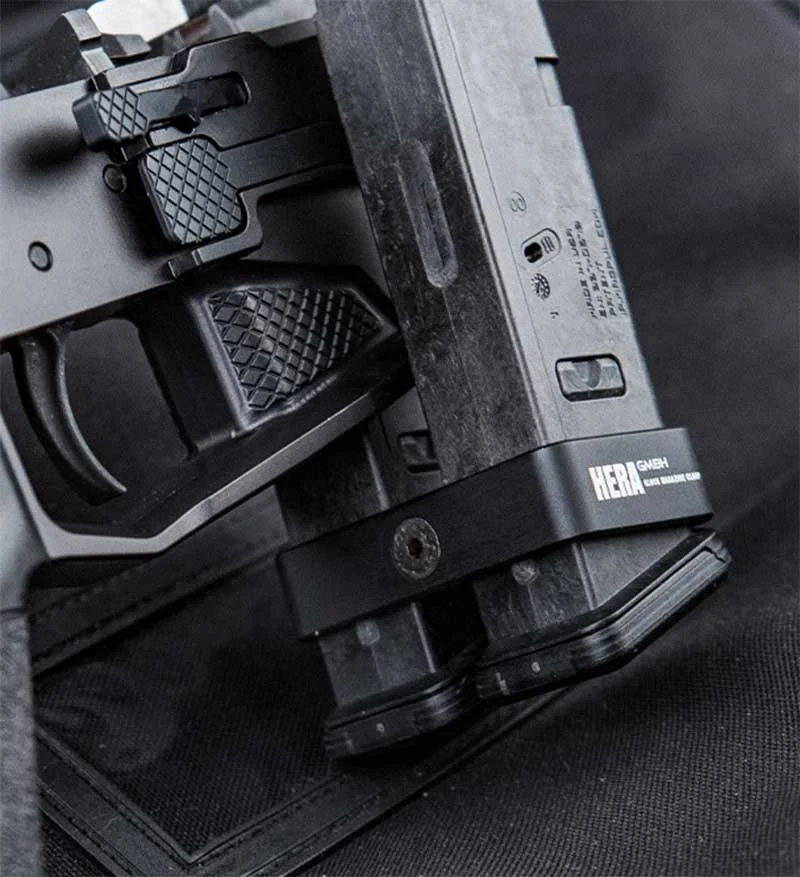 Machined aluminum magazine clamp which allows the coupling of 2 Glock 17 style magazines. Great with the Glock 32 round magazines for the Triarii pistol chassis. Made in Germany.